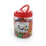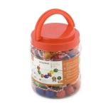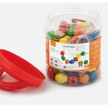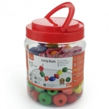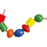 A plastic jar contains large wooden beads and colorful laces on which the beads can be strung. Bead size approx. 2 x 2 cm depending on the type. Package dimensions approx. 16 x 12 cm. Contains 90 beads and 5 strings. Age 3+.