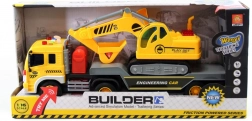 A fun set for little drivers featuring a large truck and an excavator in 1:16 scale. Press the buttons on the hood to trigger realistic sounds and lights, and use the tilting ramp for easy loading. Button batteries are included. Suitable for children ages 3+.