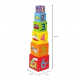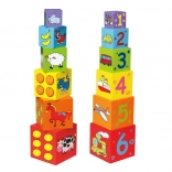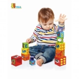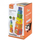 Each side of the block is decorated with different motifs, such as animals, numbers, fruit, and vehicles, which enrich children's imagination.