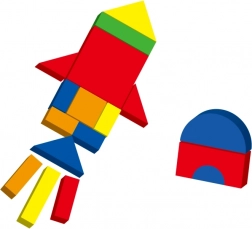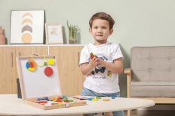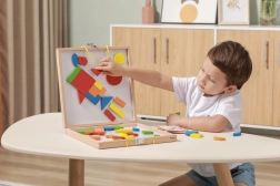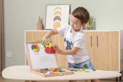 The set includes 42 wooden magnetic pieces in various shapes and colors, as well as 12 double-sided cards with a total of 24 imaginative templates for an easy start. While playing, children practice fine motor skills, hand–eye coordination, perception of colors and shapes, and spatial imagination.