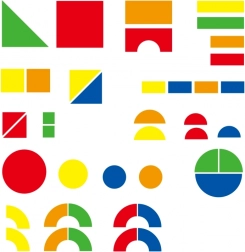 mix of basic colors (red, blue, yellow, green) and geometric shapes