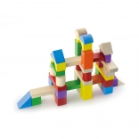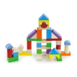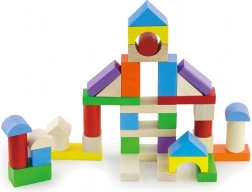 Blocks in the form of rectangular blocks, cubes, cylinders, and arches (size 2.5–7.5 cm) inspire towers, bridges, and entire little towns.