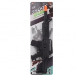 A fun and safe plastic toy submachine gun for kids, 40 cm long, in a black finish. When the trigger is pressed, it produces a realistic shooting sound without batteries. An ideal toy for action soldier role-play, suitable from age 3.