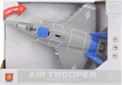 Battery-powered fighter jet that emits sounds and lights up when buttons are pressed.