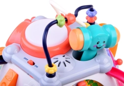 - Hammer side: hitting the buttons moves a ball through a transparent tunnel with accompanying sounds and lights; plus a movable banana and little apple on a self-retracting cord.