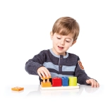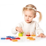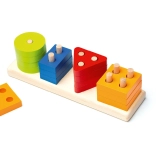 This high-quality wooden puzzle offers 16 colorful geometric shapes that are threaded onto pegs on a rectangular base. While playing, children learn to recognize colors and shapes, try different combinations, and naturally practice coordination and patience.