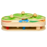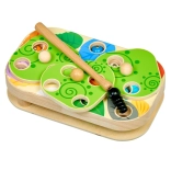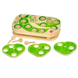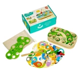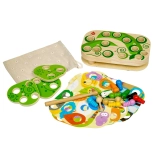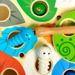 The fun and educational game Lucy & Leo Catching Caterpillars develops fine motor skills, logical thinking, and hand–eye coordination. Using a magnetic wand, children catch colorful caterpillars into the holes in the wooden board and try different difficulty levels with interchangeable templates and rotating leaves.