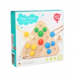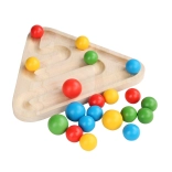 Discover creative fun and learning in one. The wooden double-sided triangular board brings two activities: sorting colored balls according to 20 templates using the included tweezers and spoon, and a dynamic maze that helps children practice patience and precision. After playing, the colored balls are stored in the linen pouch to keep everything together.