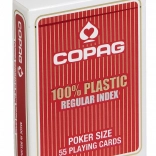 Durable 100% plastic poker cards PKJ in red design with large indexes in two corners for easy readability. Ideal for home games and club use thanks to long lifespan, smooth shuffling, and moisture resistance.