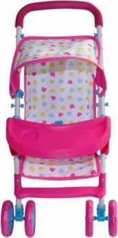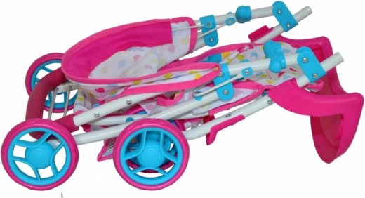 Kate is a stroller for dolls up to 50 cm long. It is equipped with a foldable canopy, a feeding tray, straps, and swiveling front wheels. It also has a basket for doll accessories needed during a walk, including milk bottles, clothes, and diapers.