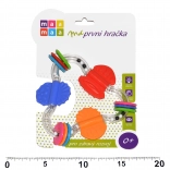 A cheerful baby rattle in the shape of a 14 cm triangle captivates little ones with its colorful design and gentle rattling sounds that soothe and support the development of gross motor skills, easy grasping, and hand–eye coordination. A safe choice for babies from birth.