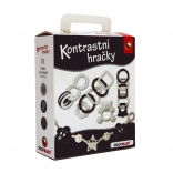 The package includes four products: a hanging bar/chain for the stroller with clips, interlocking textured loops and hooks for attaching toys, a soft teether for teething relief, and rattle elements for sensory exploration. Everything is made from non-toxic materials, with no sharp edges or small detachable parts that could be dangerous.
