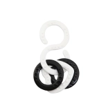 Interlocking silicone loops with relief textures massage gums, support tactile development, and allow easy grasping. S-hooks attach toys to a stroller or car seat.