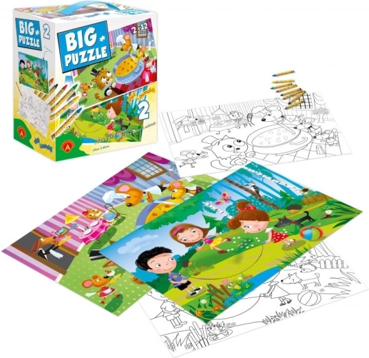 Discover the creative set of two double-sided puzzles by ALEXANDER that combines fun and learning. Each puzzle has large pieces for small hands (12 pcs), measures 67 × 47 cm, and features a colorful design on one side and a black-and-white image to color on the other. A set of crayons is included so kids can start creating right away. Great for developing motor skills, logical thinking, and creativity for children aged 3 and up.