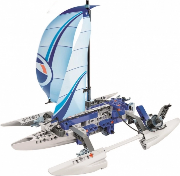 A construction kit to build 10 boat models that really float. The main model, a trimaran, is equipped with an adjustable rudder and sails. In total, 10 different models actually float. Free app with an interactive 3D manual. Made in Italy.