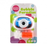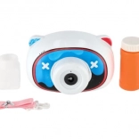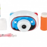 While generating bubbles, the toy produces melodies and camera sounds for an authentic experience.