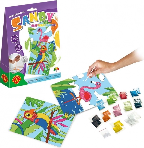 With ALEXANDER sand art, children gradually reveal the self-adhesive areas of the picture and sprinkle them with colored sand following the template. Thanks to the included glitter brocade, both the parrot and the flamingo gain an impressive shine. The activity is soothing, develops a sense of color, and delivers a beautiful result even without prior experience.
