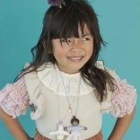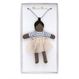 The necklace is made of a wonderfully crafted doll named Ruby and a blue chain with beads. The Ruby doll is made of cotton and has a beautiful peach-colored tulle skirt.
