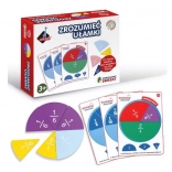 The set includes wooden pieces illustrating the fractions 1/2, 1/3, 1/4, 1/5, 1/6, 1/8, 1/10, and is complemented by matching activity cards.