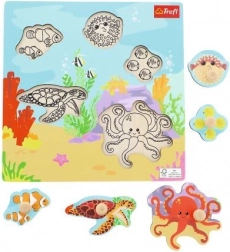 Discover the magic of the ocean with wooden puzzles that combine quality craftsmanship and educational value. Each piece has a wooden knob for easy grip, and the base with a black-and-white silhouette shows where each piece belongs. Thanks to sturdy wood, the puzzles are durable and ideal for small children's hands.