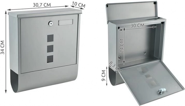 Specifications: Material: Stainless galvanized steel; Format: A4; Dimensions: 10 x 30.7 x 34 cm; Mailbox Weight: 1.95 kg.