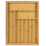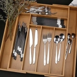 The organizer is designed to keep items clearly arranged and to make everyday use easier. The smooth bamboo finish reduces dirt buildup and allows easy maintenance under running water. Practical height and compartment layout ensure convenient storage of spoons, forks, knives, and small accessories.