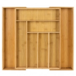 Declutter your cutlery, knives, and kitchen tools with the timeless RUHHY bamboo organizer. Thanks to the expandable side sections, you get a flexible layout with 6–8 compartments that easily adapts to the contents and the width of your drawer. The natural material stands out for its durability, quick drying, and aesthetic look that fits any modern kitchen.