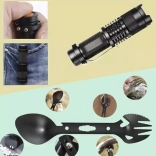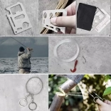 - folding knife with saw and cord cutter, tactical pen, 11-in-1 survival card, fire starter with magnesium rod and striker with ruler and opener, flashlight, thermal blanket 130 × 210 cm, sealable container, bottle holder for belt, paracord bracelet (approx. 3.5 m of cord) with compass, whistle, and fire starter, 2 silicone lures + fishing line + 2 hooks, eating tool (spoon/fork with opener + small knife), folding whistle, 2 tinder cords, 2 carabiners, wire saw approx. 60 cm