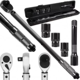 Robust 1/2" torque wrench with ratchet and a 17/19/21 mm socket set plus an extension for precise tightening and loosening of threaded connections. Offers a torque range of 28–210 Nm, bidirectional operation right/left, LOCK/UNLOCK locking, and a practical protective case for safe storage. Ideal for hex and square bolts, hooks, and motorcycle nuts.