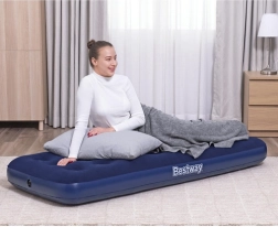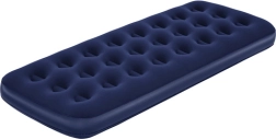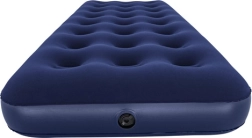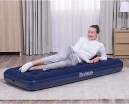 Practical inflatable mattress for one person measuring 185 × 76 × 22 cm from BESTWAY, ideal for home and travel. It features a pleasant velour surface, durable coil-beam construction, a safety valve for easy inflation and deflation, and the package includes a self-adhesive patch.