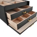 An elegant jewelry box in black PU leather with 20 compartments, 2 drawers, and a mirror keeps your jewelry organized and secure. Thanks to the key lock and soft velvet interior, it protects pieces from damage, while the gold-tone metal details add a timeless, luxurious look.
