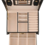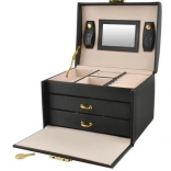 Black PU leather with gold accents and a practical lid mirror combine style and functionality for everyday jewelry care.