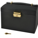 The interior lining made of soft material gently cares for jewelry surfaces to prevent scratches. Thanks to the practical handle, the jewelry box is easy to carry, and its compact size fits both on a vanity and in a drawer. The timeless black color and gold accents highlight an elegant interior character.