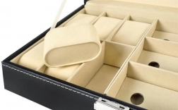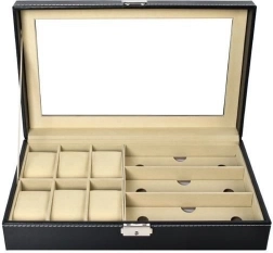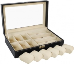 This elegant black organizer with white stitching combines a refined look with practicality. The glass lid allows a clear presentation of the contents, while separate compartments with a soft lining protect watches, glasses, and other jewelry from scratches and unwanted contact.