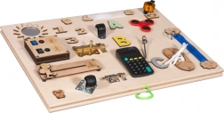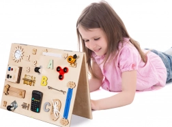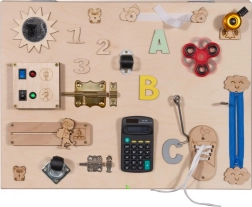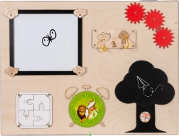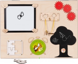This wooden manipulative board is full of diverse play elements that help children develop their skills. Children can play with various interactive mechanisms that guarantee long hours of fun.