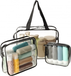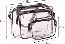 Practical set of 3 transparent toiletry bags made of durable, water-resistant PVC makes travel and everyday organization easier. Various sizes, zip closure, and easy cleaning keep things tidy in your suitcase, backpack, and bathroom. The transparent material speeds up airport security checks and helps you quickly find what you need.