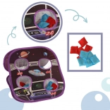 A double-sided toy with a space theme brings excitement and fun to children both at home and in the garden. There are two types of targets available: one side of the glowing circular board attracts the contact surfaces of soft velcro balls, while the other side requires children to hit bag holes.