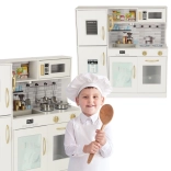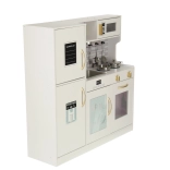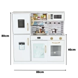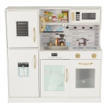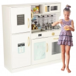 The kitchen includes a fridge with freezer, dishwasher, microwave, stove, and oven, making it realistic and interactive. There is even a phone on the fridge for calling about family recipes. The kitchen's design with white color and gold elements perfectly fits any child's room.