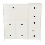 The white wooden structure with metal accessories like pots, pans, and kitchenware allows versatile use and is a stylish addition to any child's room.