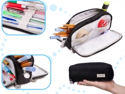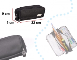 A practical 3‑in‑1 school case with a triple compartment that holds all essential writing supplies and also works as a cosmetic bag or travel organizer. Made of durable polyester, it has compact dimensions and a zip closure to keep small items secure.