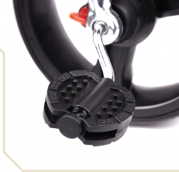 - Safety and control: 5-point harness (strap), removable safety bar, rear brake, rubber grips.