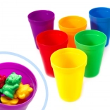 Six colorful cups support sorting by color, number, and size. Great for visual organization and building math habits.