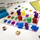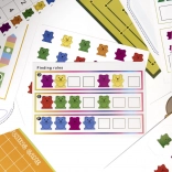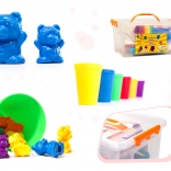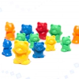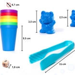 The set includes small and large plastic bears in six colors. Children learn numbers, comparison, and creating simple equations in a playful way.