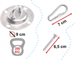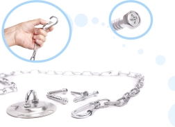 A complete set with hook, screws, chain, and carabiners makes installation easy. Suitable for mounting into wood and concrete (when using appropriate wall plugs/anchors).