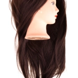 Professional training head for hairdressers with long brown hair, ideal for practicing cuts, updos, and heat-styling techniques. The hair is aligned with the direction of growth, so it is easy to detangle, dense, and allows for precise sectioning. A great tool for beginners and advanced users and essential equipment for courses, competitions, and demonstrations.