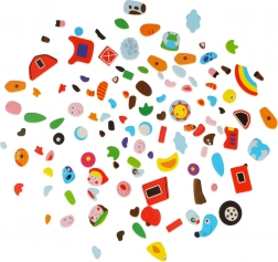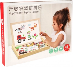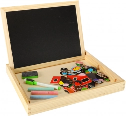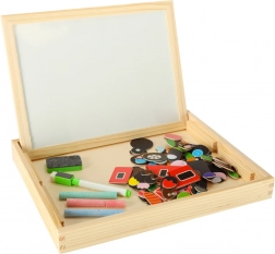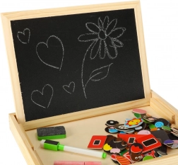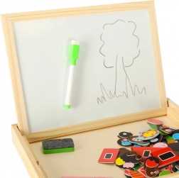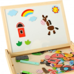 Double-sided wooden board with magnetic puzzles is ideal for children's creative fun. The board is made of high-quality natural wood and includes various elements that support learning and playing.