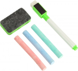 The set includes everything needed, including colored chalks, a sponge, and felt-tip markers for complete fun.