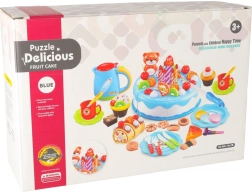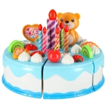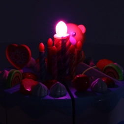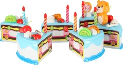Six cake slices connected with hook-and-loop can be safely cut with the plastic knife and reattached. Children can decorate it with candles, fruit, and a cute teddy bear—differently every time.