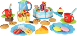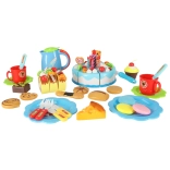 Plates, cups, cutlery, and a teapot complement the cake and desserts. Ideal for cooperative play, serving, and learning manners and sharing.