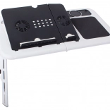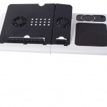 The table is equipped with two USB fans that effectively cool your laptop and prevent overheating. It also comes with a mouse pad, cup holder, and pen for even greater practicality.